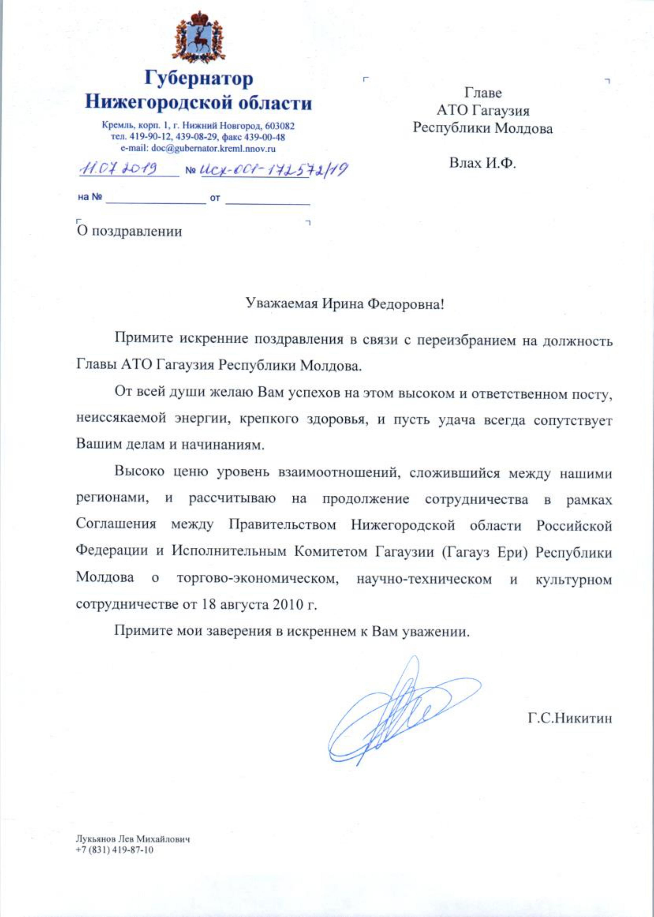 В своем поздравлении господин Никитин высоко оценил уровень взаимоотношений, который сложился между Нижегородской областью и АТО Гагаузия, а также выразил надежду на продолжение сотрудничества.